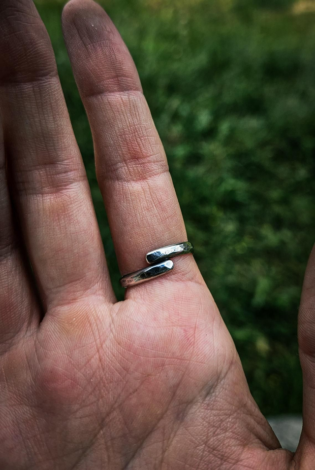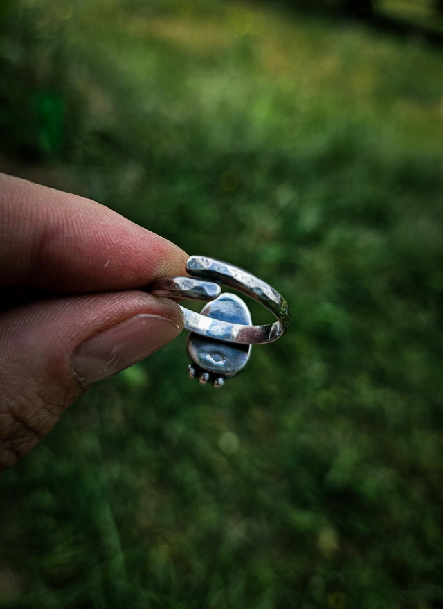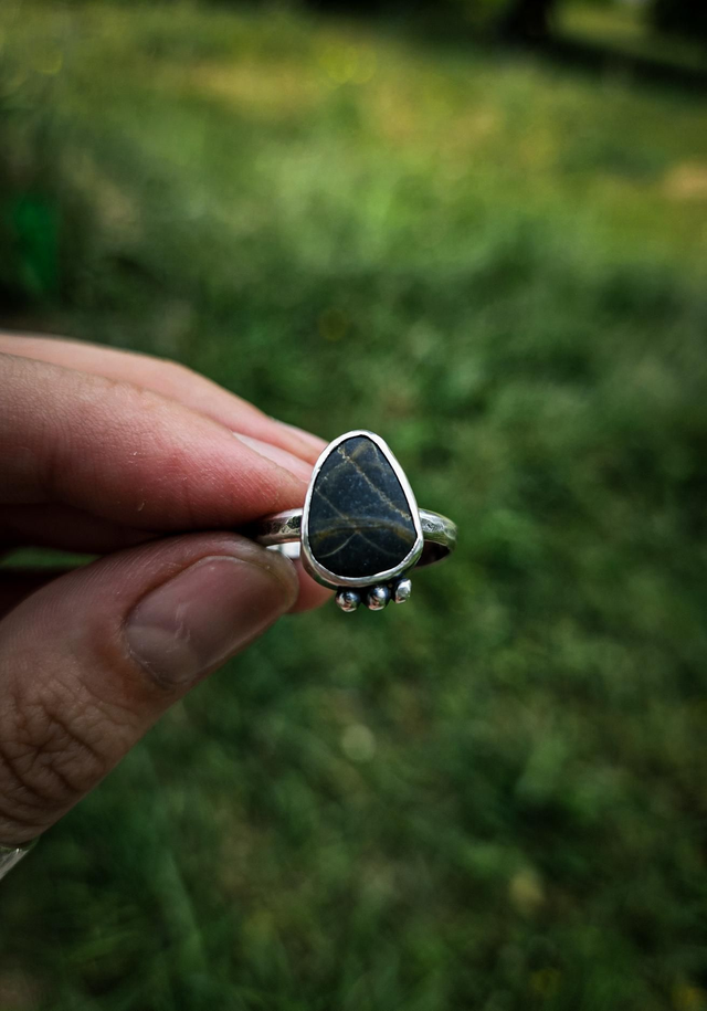 Cette bague en argent se pare d'une pierre noire ramassée au bord de l’océan. Sa texture martelée lui procure un aspect authentique et brut, qui rappelle la beauté de la nature.